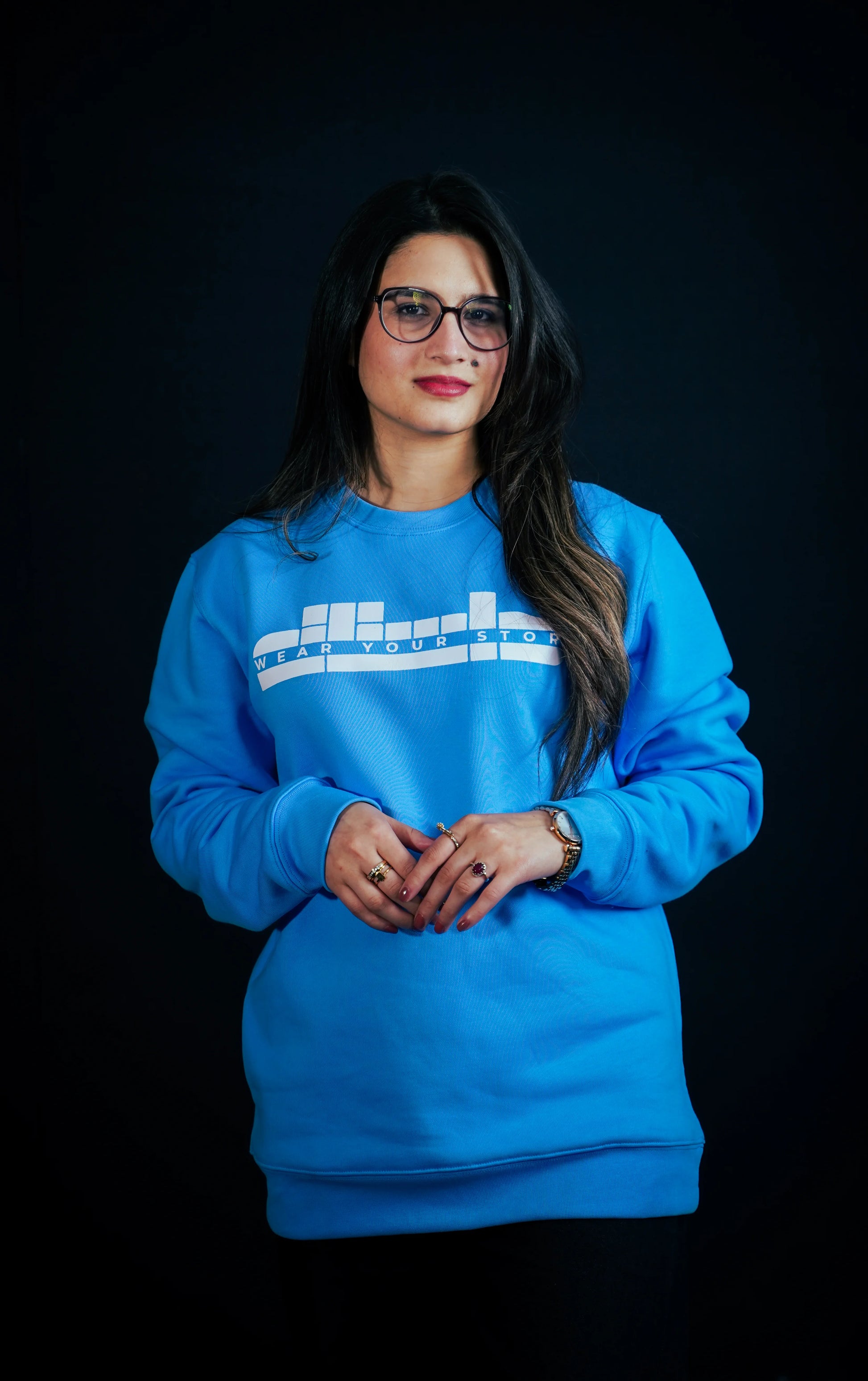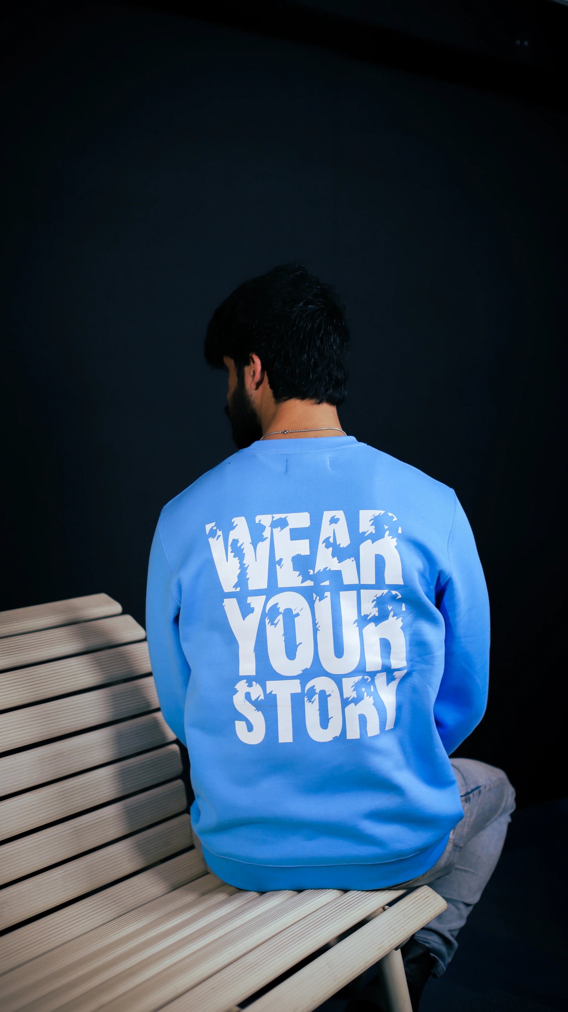 A Fluffy Blue Sweat Shirt made with 400 Plus GSM Export Quality Fleece with a large Daastaan logo in urdu and wear your story tagline between it with Premium Quality high density print and a big Wear Your Story printed at the back